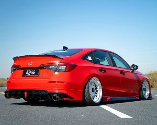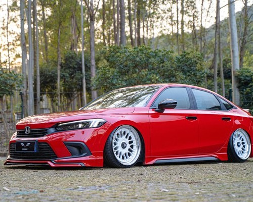 AIRBFTsuspension trendy attitude modification culture center:The 11th generation Honda Civic stancenation has a cool figure, the brand-new eleventh-generation Honda Civic will be launched in September 2021, with a brand-new design language, and the overall style is more refreshing and concise. The 11th-generation Civic we shared today should be the world’s first modified aerodynamic suspension low-lying case. The Chinese red color matches the ultra-low body posture.